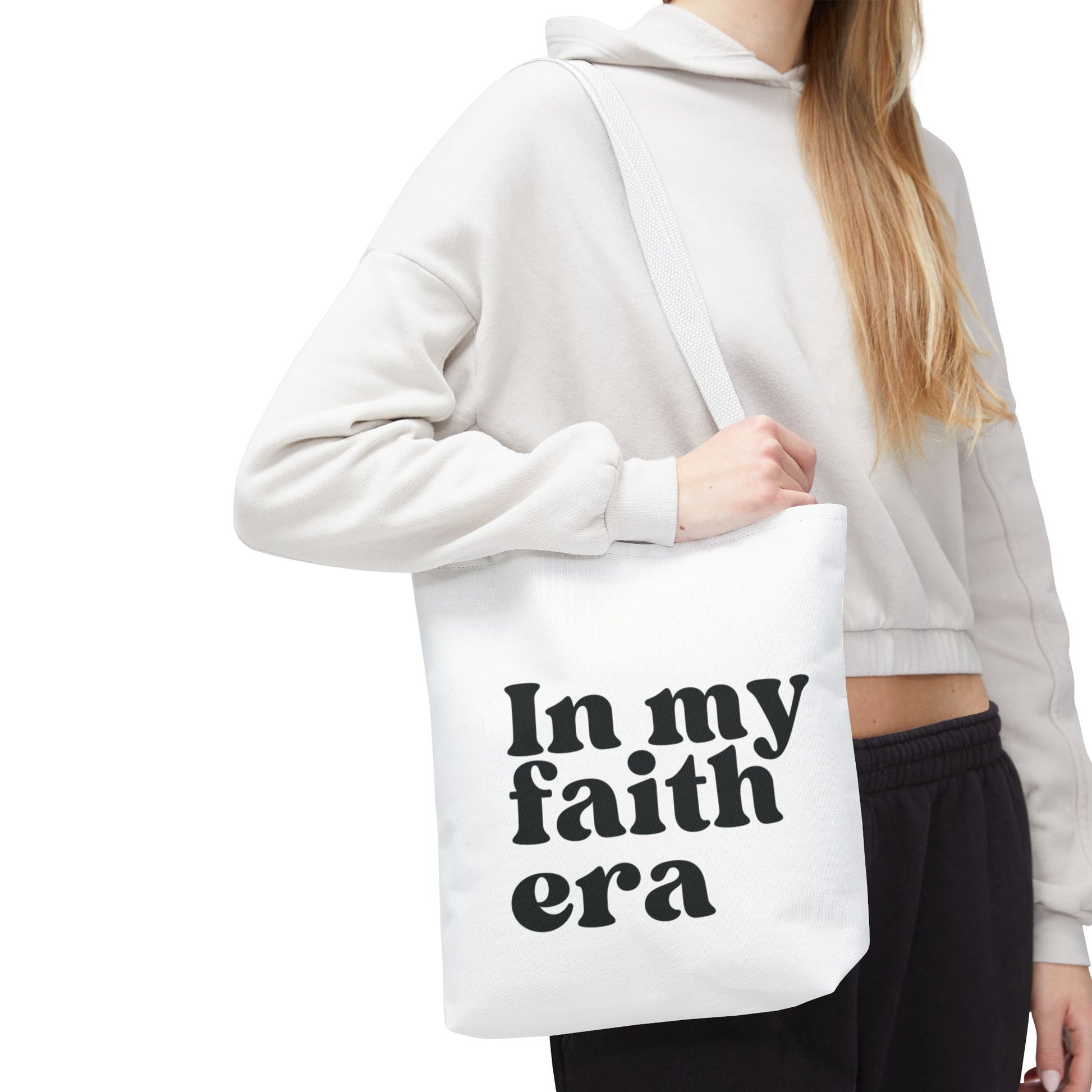Step into every day with purpose and style with the Faith Era tote bag. Perfectly designed for those who walk in faith, this tote offers ample space for all your essentials while carrying a message of strength, hope, and grace. Crafted from 100% polyester durable, high-quality materials, it’s built to last and keep up with your busy lifestyle. Whether you're running errands, going to work, or attending church, the Faith Era tote is your go-to companion. Elevate your everyday look and carry your faith wherever you go—because your faith is always in season.